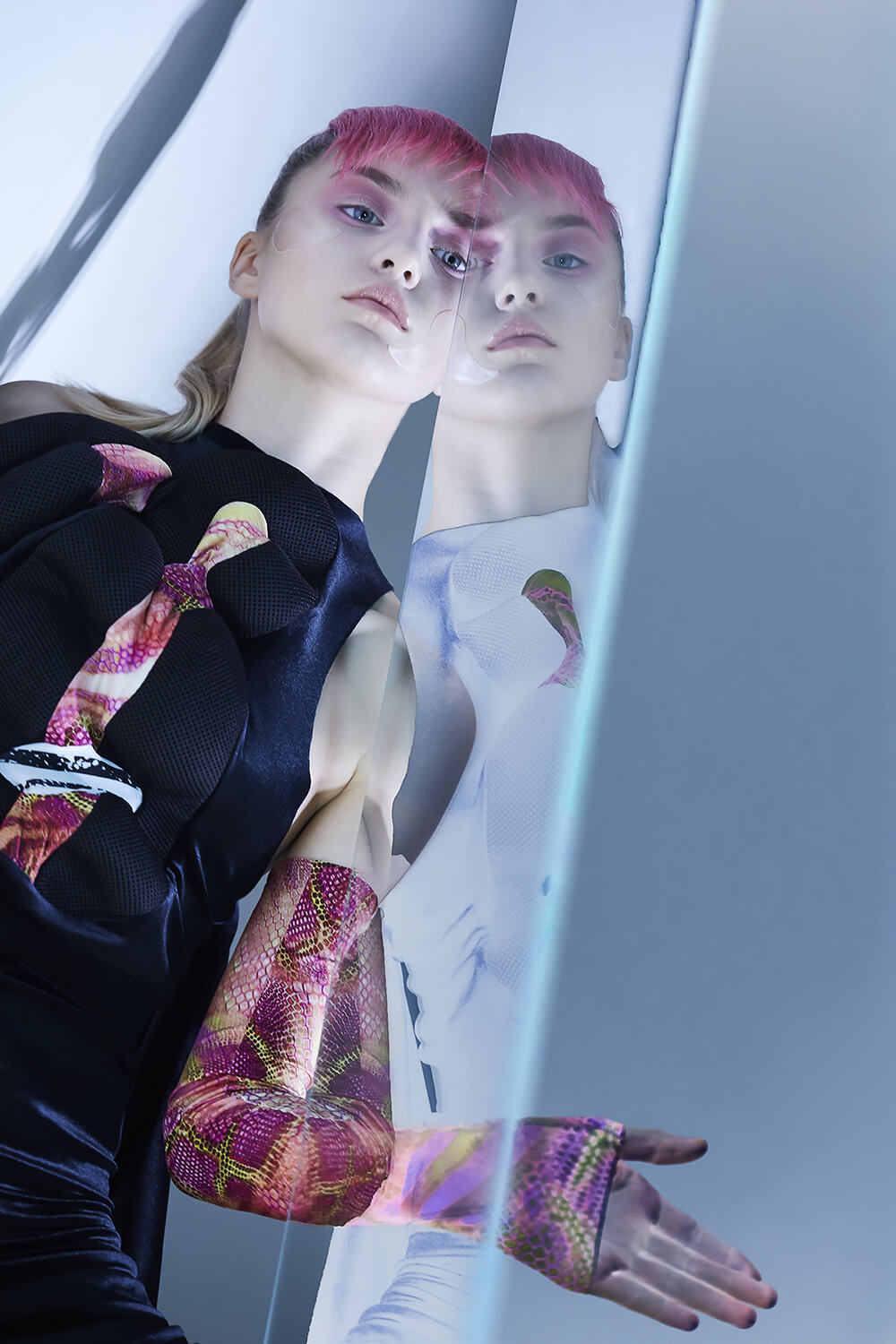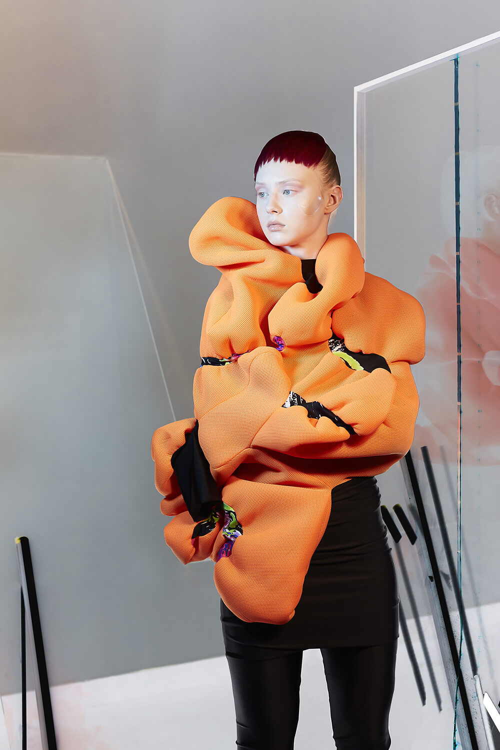 Tematika je daná obory, které s Františkem děláme. Od toho se vše odvíjelo. Módní průmysl je specifický vlastně i tím, kde se tvorba musí prezentovat na těle modelek. Sama jsem modelku dělala, takže s tím mám bohaté zkušenosti. Pro modelky jsou přísná kritéria, abyste mohli vůbec takto pracovat. Oděv na modelce musí padnout, jinak nemůžete předvádět. Na přehlídku se šije oděv často v jedné univerzální velikosti, aby si ho právě pak mohla obléct kterákoliv dívka. My jsme chtěli naproti tomu ušít „oděv“ na objekty tak, aby přesně padl a splynul s ním.