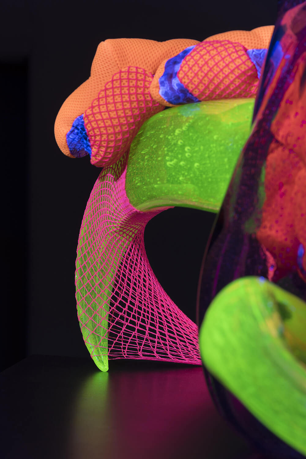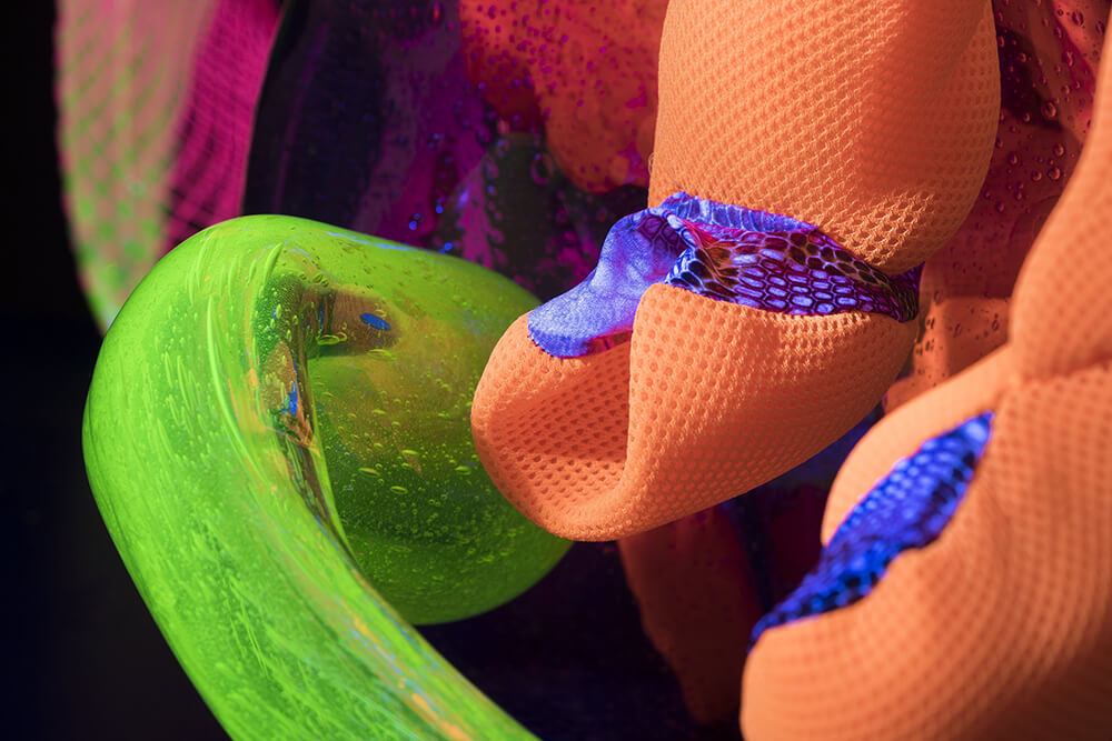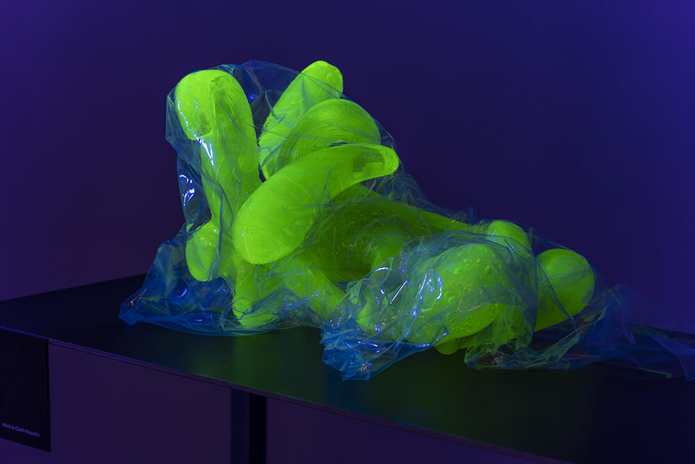 Je tam hodně spojitostí, které skrze objekty vnímáme. Propojujeme módu a sklo. Objekty jsou naše modelky, které oblékáme. Každý objekt má i svůj název, který odkazuje ke jménům slavných modelek, jako například Černý objekt Cindy – Cindy Crawford. Jména jsme rozřazovali dle vlastního pocitu a toho, co nám daný objekt připomíná. Například oranžový objekt Veruschka má název po modelce z 50. let, pro niž je typická fotografie, kde vypadá jako takový pavouk nebo chobotnice s chapadly. Konkrétně pro nás to jsou taková zvířátka, která by klidně mohla začít chodit. S Františkem bereme objekty jako naše vlastní stvořená zvířátka/entity. Myslím, že to máme s Františkem společné. Máme rádi nadsázku, ale musí být smysluplná. Zároveň rádi utíkáme do vlastních světů a chceme je ukázat dalším lidem. Což se nám, myslím, výstavou povedlo.