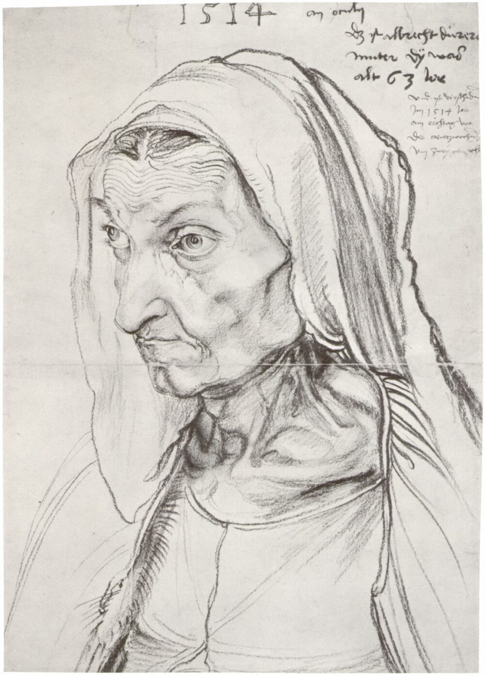 Jedním z prvních umělců, který se rozhodl kromě tradičních uměleckých motivů zachytit i podoby své matky, byl německý grafik a malíř Albrecht Dürer. Jedna z jeho malých kreseb uhlem nese název Portrét matky umělce ve věku 63 let a jde o něžnou, ale nepřikrášleně realistickou studii jeho matky Barbary Holperové. Obraz dokončil v roce 1514, dva měsíce před její smrtí. Dürer měl ke své matce velmi blízko, což je z této drobné kresby více než patrné. Po její smrti později napsal: „Cítil jsem se tak utrápeně, že to ani nedokážu vyjádřit.“ Ve své hluboké melancholii a smutné pochmurnosti se proto tato malá podobizna dosud porovnává s jeho dvěma důležitými a slavnými velkými rytinami s názvy Melencolia I. a Madona u zdi.