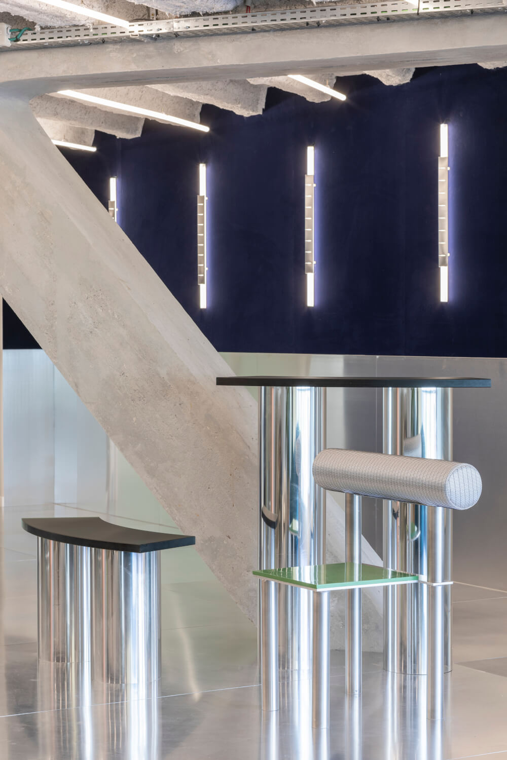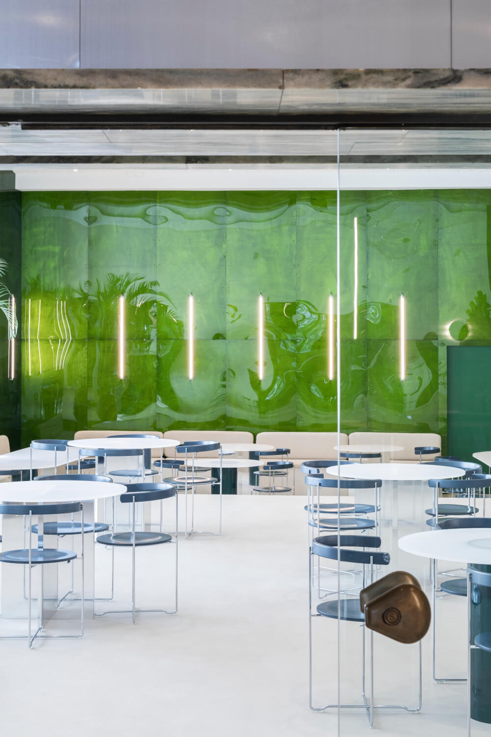 Základ designového konceptu tvoří odkazy k originálním prvkům monumentálního art deco komplexu Shell, postavenému v letech 1932 až 1934 podle plánů architektů Alexise Dumonta a Marcela Van Goethema. Nejvíc spojitostí, hlavně v barevné paletě (s tmavě modrou, zelenou, červenou, bílou, šedou a béžovou), se váže na podlahu v oválné hale, dílu belgického sochaře Oliviera Strebelleho, ke tříbarevnému mramoru a vložené keramice. Původní materiály, které jsou v budově stále přítomné, jako travertin, mramor a beton, jsou zkombinovány s novými, jako jsou latex, hlína, nerezová ocel, pěna, pryskyřice, samet a hliník. Vznikl tak vesmír elegantní a zábavný, kontrastní, a přesto jednolitý. Kenny Decommer a Hugues Delaunay se netají tím, že je baví 80. léta a vizuální slovník postmodernistů a rádi jej přetavují do svého rukopisu.