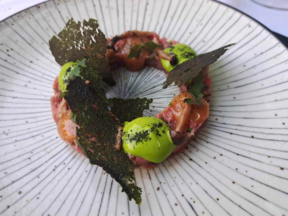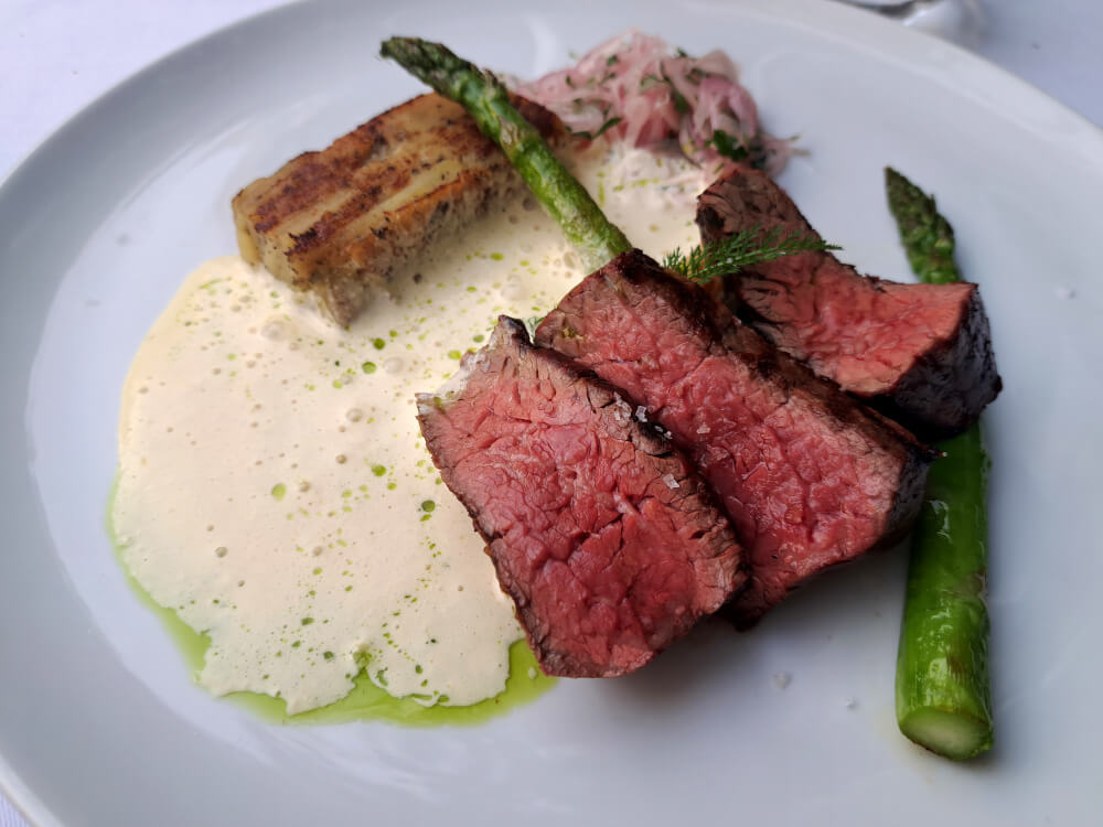 Kromě Sabatelliho menu můžete samozřejmě ochutnat i oblíbené stálice zdejšího menu jako telecí tartar s lanýžovým žloutkovým gelem, majonézou shiso a marinovanými houbami. Efektní plating ve tvaru věnce přímo volá po sdílení na sociálních sítích a chuťově nelze tartaru také nic vytknout. Hovězí pupek s chřestem z Hostína, gratinovanými novými bramborami a béarnskou omáčkou potěší všechny milovníky kvalitního hovězího, vyhlášené jsou i zdejší dezerty – my se nechali zlákat ke kokosovému cheesecaku s marakujovým sorbetem.