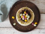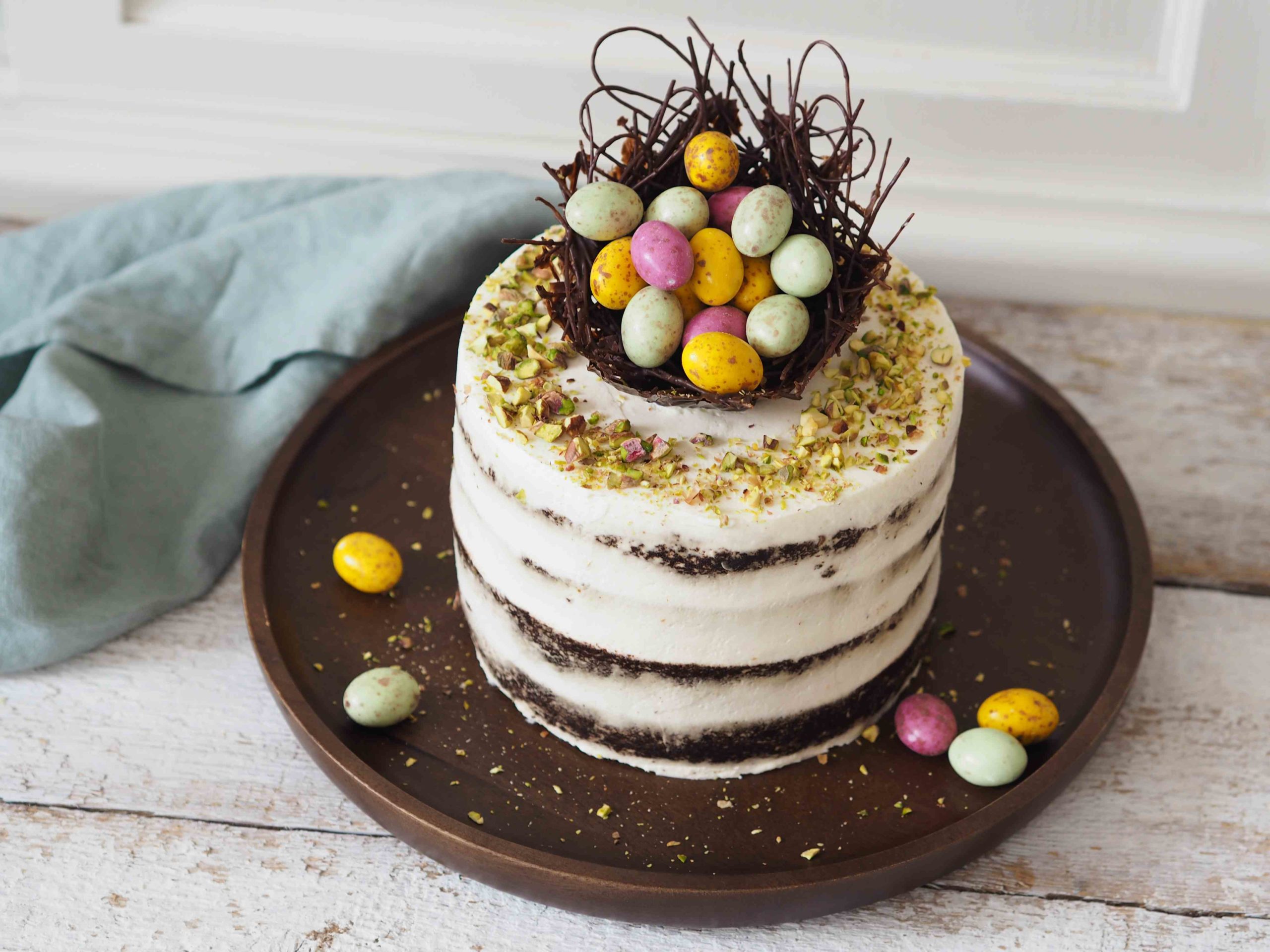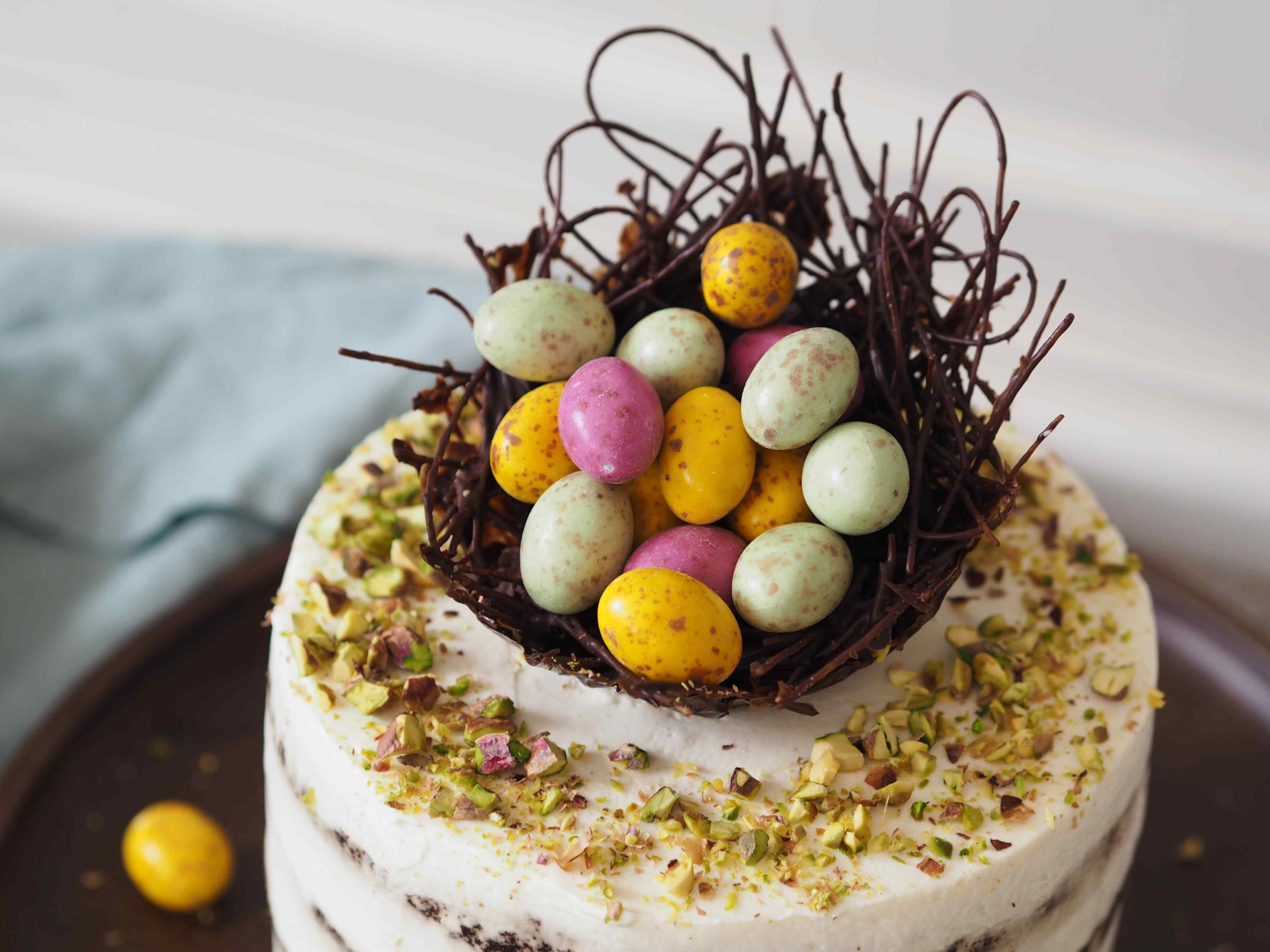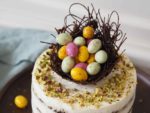 14. Hotový dort posypete nasekanými pistáciemi, ozdobíte čokoládovým hnízdem a vysypete velikonočními vajíčky. Hnízdo není určené k jídlu, slouží pouze jako dekorace.