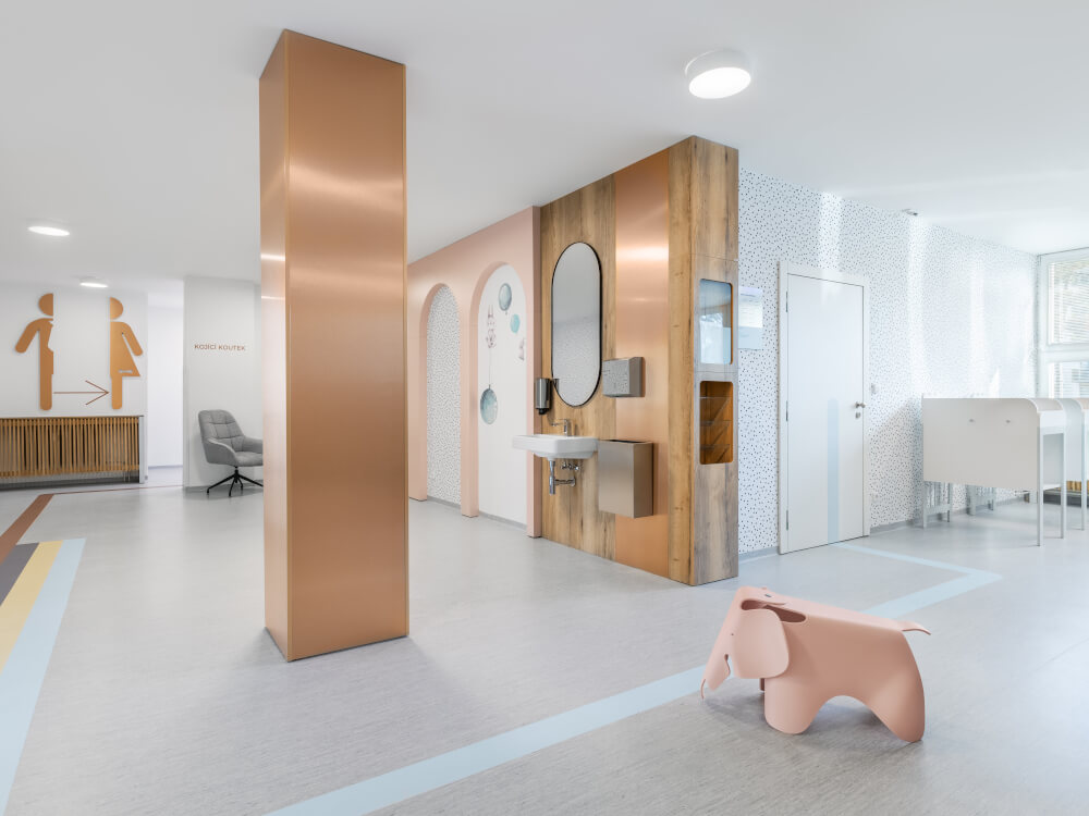 Musí být prostor určený dětem plný křiklavých barev a plastových hraček? Nemusí, řekla si architektka Kristýna úpů§§§¨dchgJandíková a pro dětské oddělení Městské polikliniky v Otrokovicích vytvořila harmonický, uklidňující a trošku pohádkový interiér čekárny. Dominují zde jemné pudrové tóny růžové, zelené a modré s bronzovými prvky.