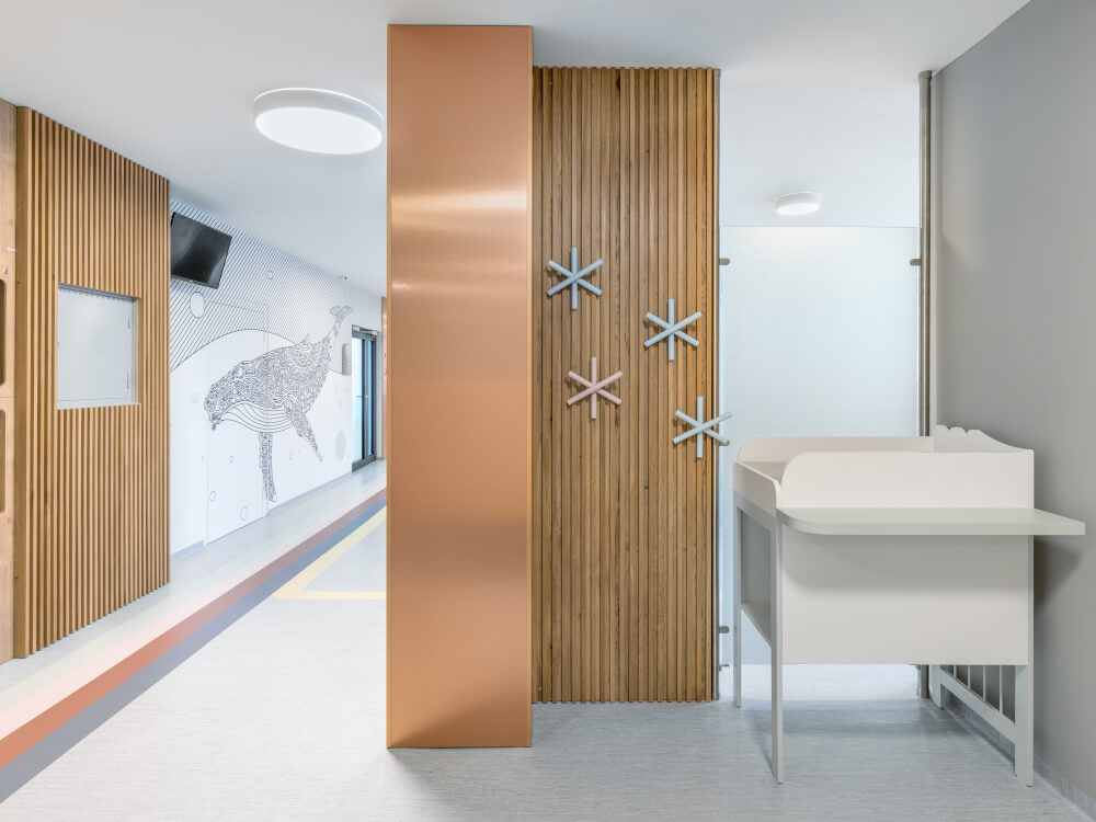 Ústředním motivem moderní čekárny a sociálního zázemí pro veřejnost i zdravotníky je tapeta velryby, která je pomyslným strážcem dětí a jejich zdraví. Kristýna Jandíková při navrhování interiéru myslela na každý detail. Stěny zdobí věšáky v podobě hvězd, sedací lavice by měly odolat častému dezinfikování, na podlaze je intuitivní navigační systém do každé ordinace. Atypické přebalovací pulty byly vyrobeny na míru a lavice v čekárně jsou díky zvýšené zadní opěrce nejen pohodlné, ale malým pacientům a jejich rodičům nabízejí potřebné soukromí.
