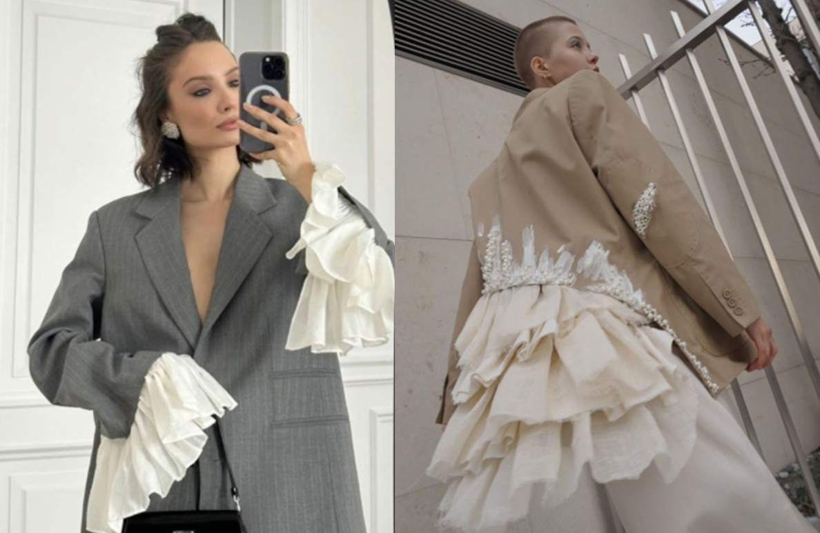 A pak je tu barva a textura. Výšivky, malba, nášivky nebo nečekané materiály jako peří či kůže dokážou posunout sako do úplně jiné dimenze. Pokud si troufnete na něco odvážnějšího, nebojte se siluetu saka zcela přetáhnout, může to vytvořit zajímavý umělecký efekt.