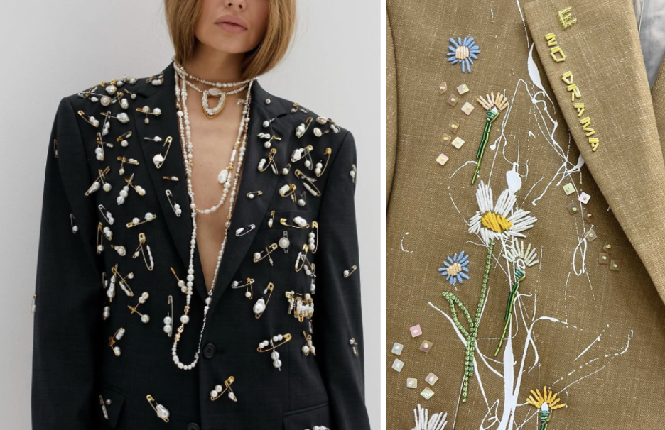 Nejjednodušší, a přitom vizuálně nejsilnější cestou, je práce s detaily. Cvočky, brože, řetízky nebo drobné přívěsky dokážou ze saka vytvořit téměř šperk. Rozmístěné nahodile působí rebelsky a punkově, systematicky zasazené zase připomínají couture přístup. Každý prvek přitom může nést osobní význam – malý talisman, vzpomínku nebo symbol.