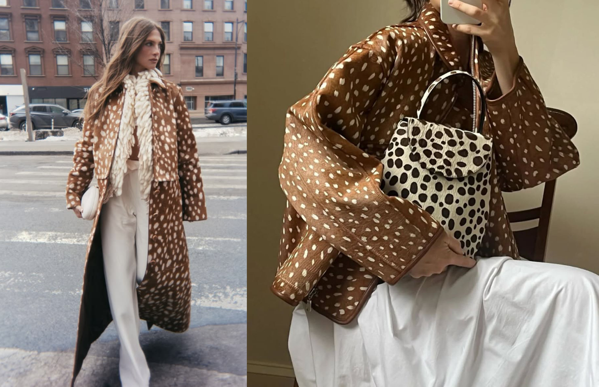 Na přehlídkách i ve street stylu se dnes objevuje především na kabátech, svetrech nebo kabelkách, ale postupně proniká i do šatů, bot a denimových kolekcí. Často se stylizuje jako jeden výrazný prvek v jinak minimalistickém outfitu – například srnčí kabát k jednoduchým džínům a bílému tričku. Ti odvážnější z nás ale mohou sáhnout po celooutfitové verzi, která má také rozhodně něco do sebe.