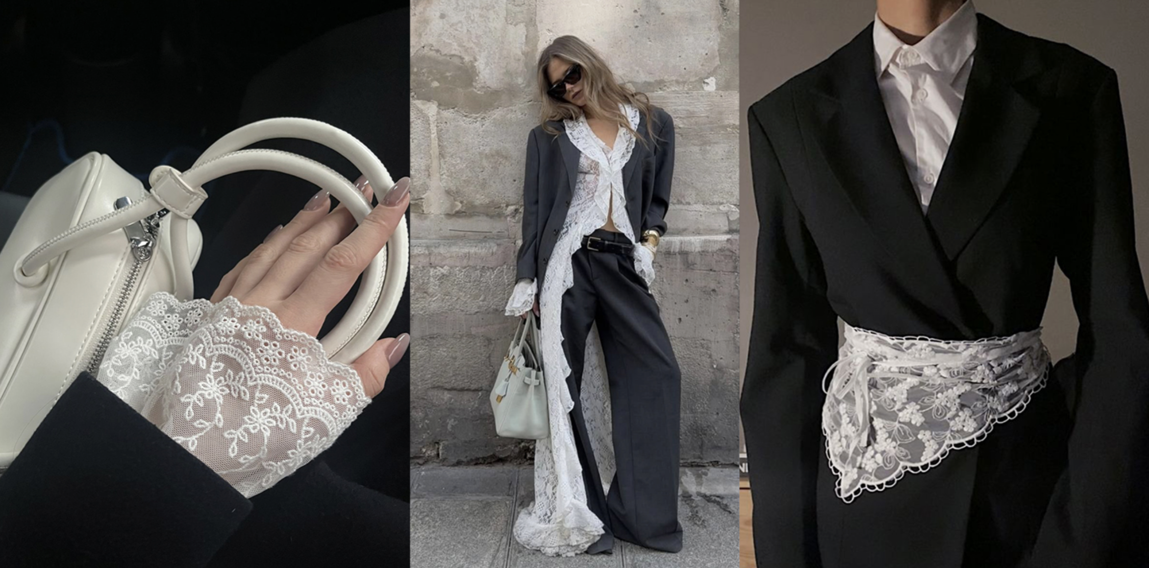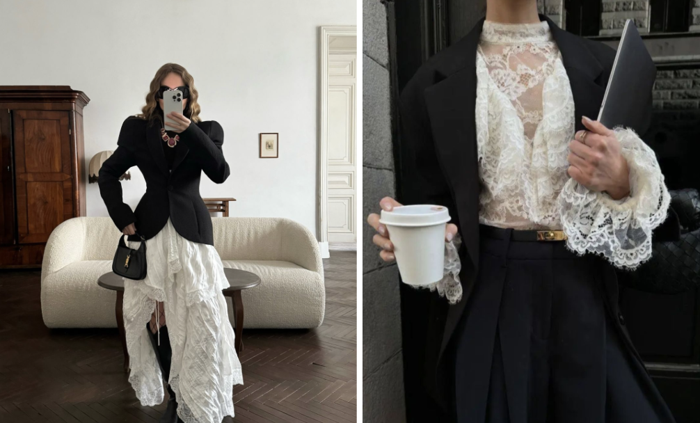 Při stylingu tohoto trendu funguje jedno jednoduché pravidlo: čím jemnější krajka, tím strukturovanější zbytek outfitu. Transparentní krajkový top si rozumí s perfektně střiženým sakem, ideálně v černé, šedé nebo tmavě modré. Krajková sukně získá úplně nový charakter, když ji doplníte pánskými mokasínami nebo minimalistickými lodičkami s ostrou špičkou. Nebojte se ani vrstvení – krajková halenka všitá do saka nebo naopak přidaná pod vestu dodá outfitu hloubku a nenucenou sofistikovanost.