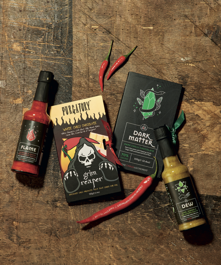 Dárky, které rozproudí krev? Co třeba koření, omáčky a čokolády s chilli? Ghost Chilli White Chocolate – bílá čokoláda s Naga chilli je ručně vyráběná delikatesa z Anglie, v níž se sladká chuť potkává s pikantním akcentem. Dark Matter od britské značky Chilli Alchemist pak v sobě ukrývá 70procentní belgickou čokoládu s Naga chilli, mátou a praskacím cukrem, jejichž spojení přináší unikátní zážitek s jemnou až střední pálivostí.
